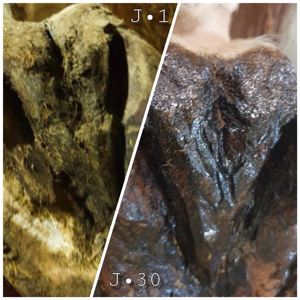 - Traitement curatif : Si « nécrose non profonde » appliquer 4 fois par semaine durant 15 jours. Si pourriture sévère de la fourchette appliquer chaque soir durant un mois puis alterner avec notre goudron de Norvège liquide journalier